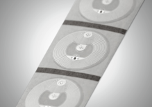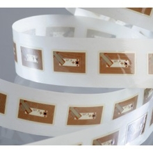 Rectangle 12 x 19 mm clear inlay with adhesive. Unprinted. NXP chip.
